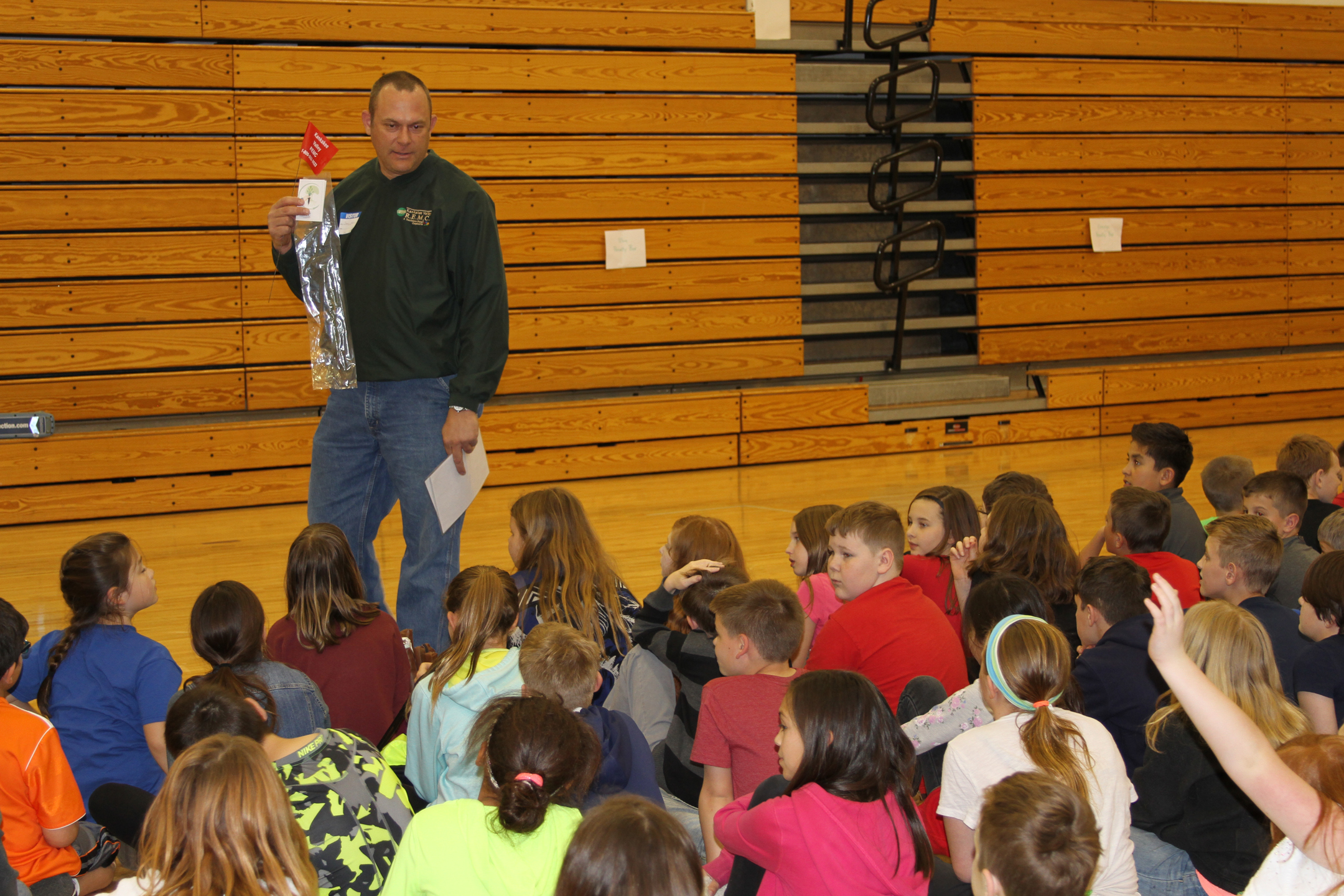 Kankakee Valley REMC employee Darrell Marks talks to students at Boone Grove Elementary about electrical safety and tree planting considerations.